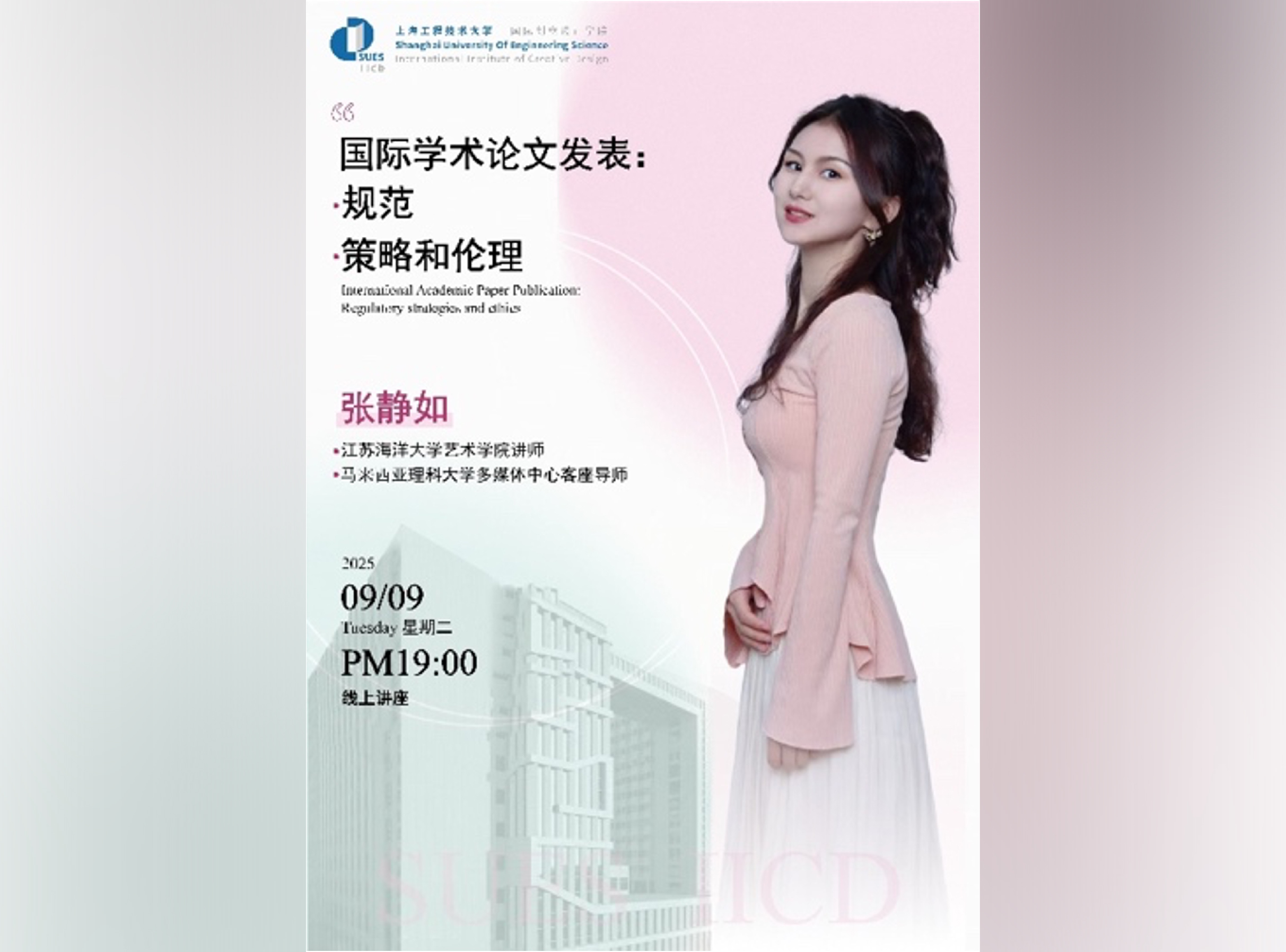 2025年9月9日,800cc全讯白菜网主站以线上形式举办“国际学术论文发表:规范、策略和伦理”专题讲座。此次讲座特邀江苏海洋大学艺术学院讲师、马来西亚理科大学多媒体中心客座导师——张静如老师主讲,针对投稿流程规范、审稿意见处理技巧及研究方法等方面进行分享。本次讲座面向2025级研究生新生,由赵悦扬老师主持,樊荣老师、王郅老师和王冠夷老师等共同参与。作为具有国际视野与丰富跨设计实践经验的创新研究者,张静如老师擅长运用...