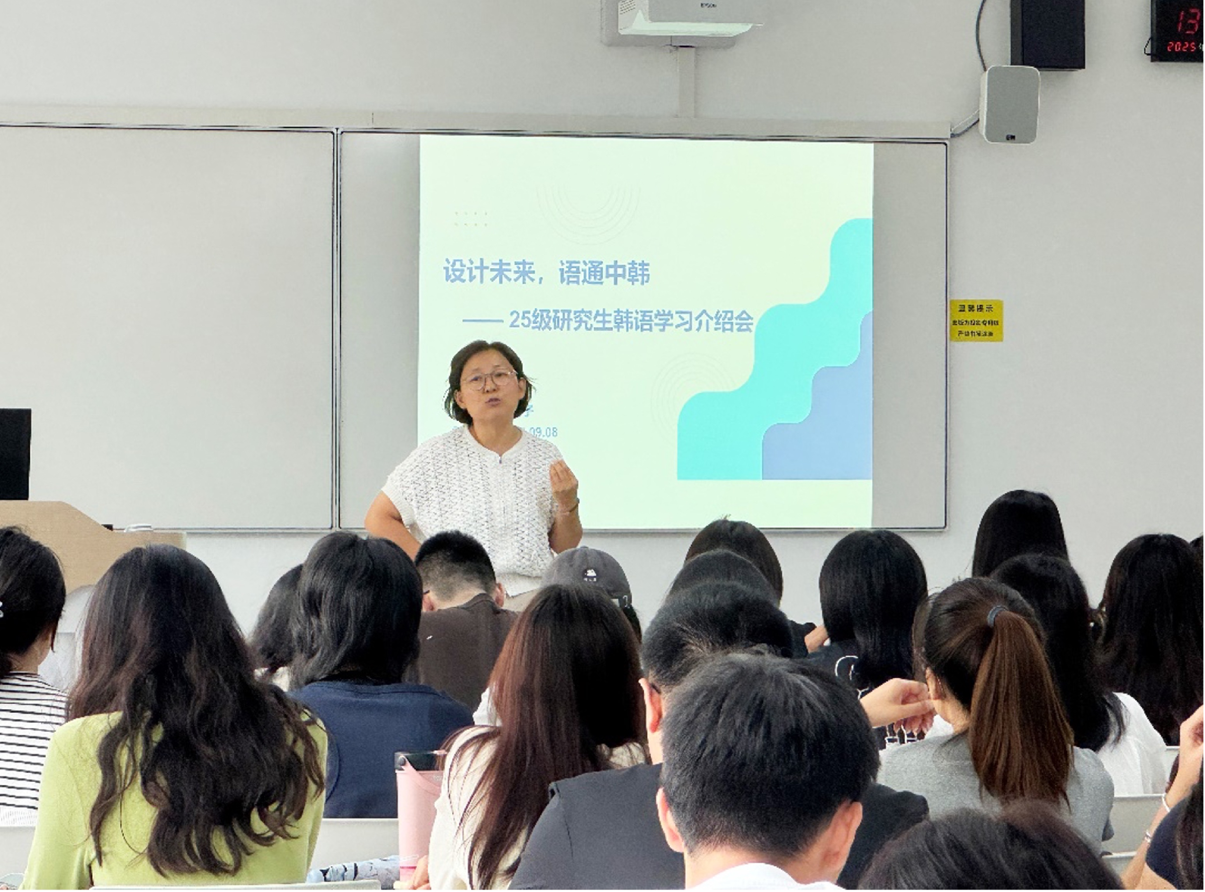 9月8日下午,800cc全讯白菜网主站在长宁校区教学楼202教室举办“设计未来、语通中韩”韩语专题讲座。讲座由李花子老师主讲, 2025级全体研究生参加,现场气氛热烈。李花子老师结合自身语言学习与教学经验,围绕“如何高效学习韩语”展开讲解,为同学们带来了一场内容实用、启发性强的语言学习讲座。她从发音训练、词汇记忆、语法学习、文化理解及考试策略等方面,帮助学生多维度掌握韩语学习的核心要点。在学习方法方面,李老师强调发...