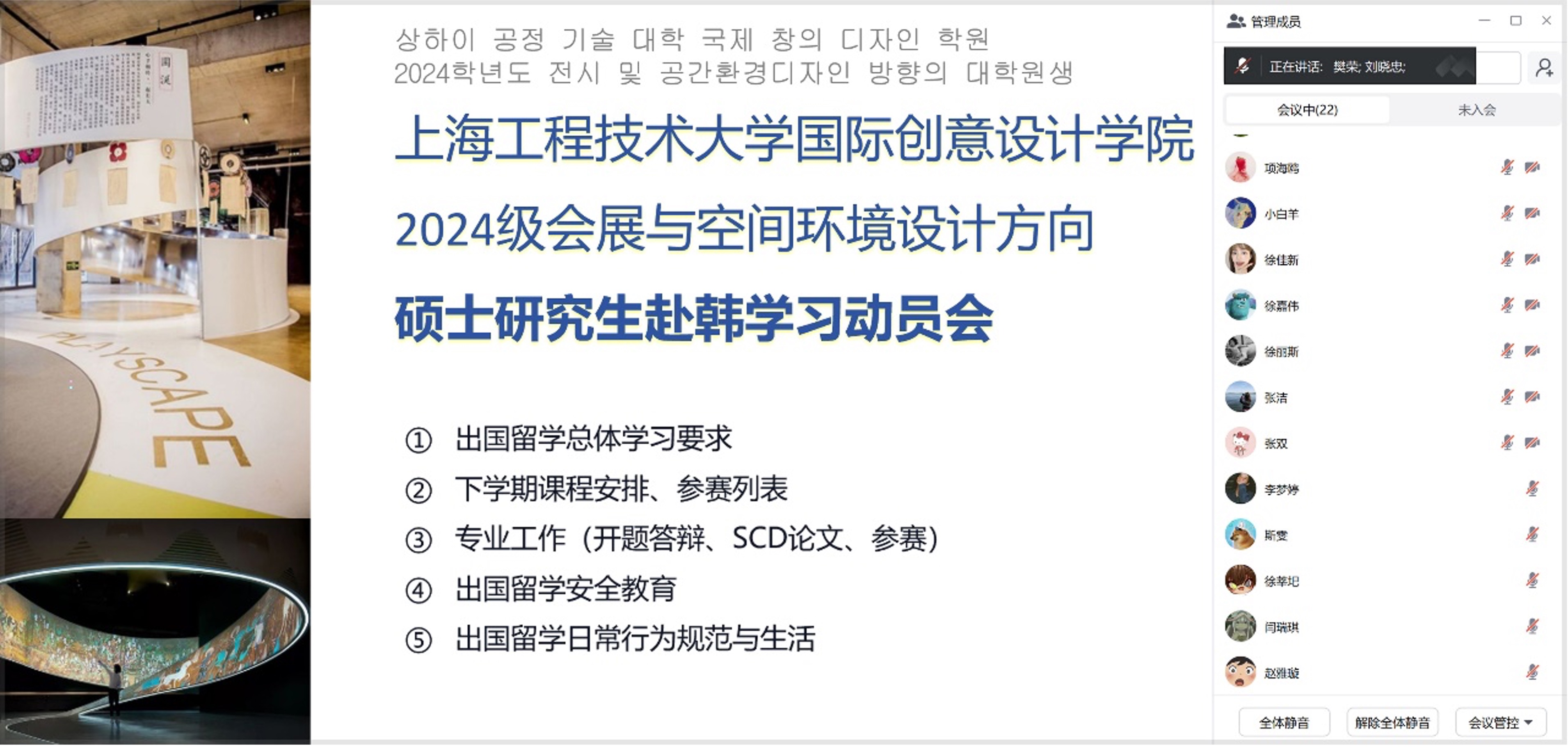 2025年8月28日晚上19:00,800cc全讯白菜网主站以线上会议形式召开了“2024级会展与空间环境设计方向硕士研究生赴韩学习动员会”。800cc全讯白菜网主站副院长樊荣、研究生秘书王冠夷、辅导员李志海、外事秘书刘晓忠及研究生导师咸妍、聂莎、徐嘉伟,会展方向全体赴韩研究生及部分学生家长出席会议,会议由樊荣副院长主持。