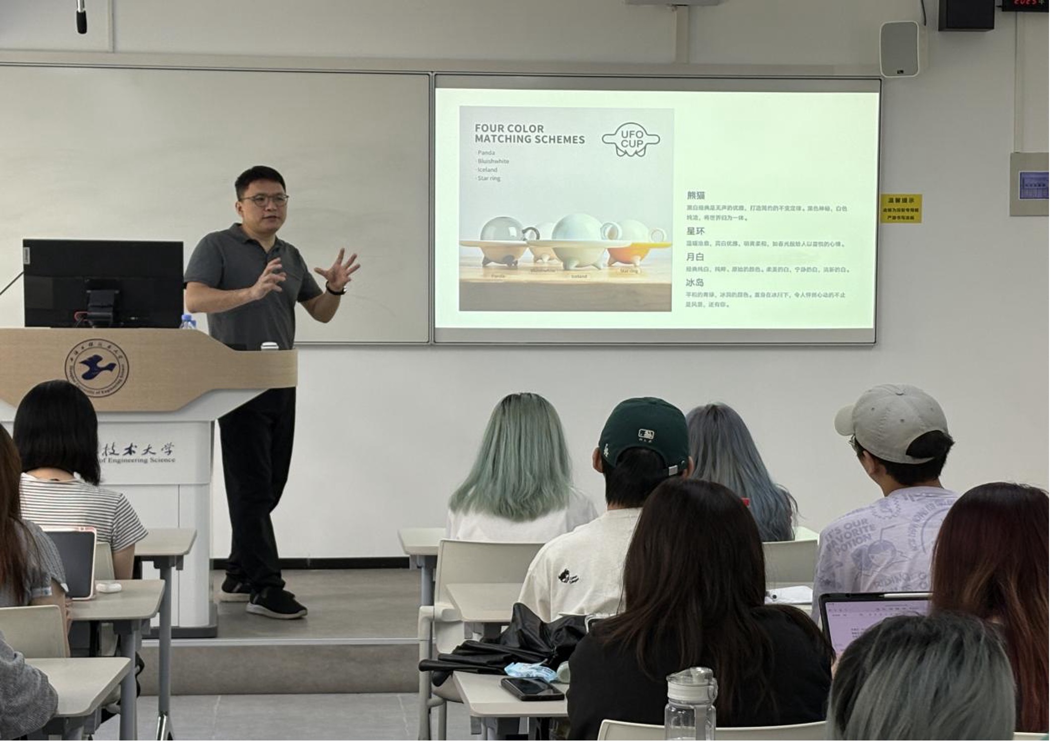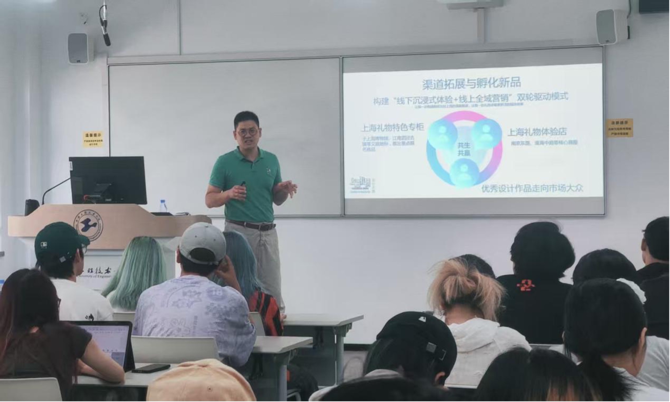 启动仪式上特别邀请到了大赛召集人、视觉中国创意社区联合创始人姜伟辉老师和中国工信部工业设计领军人才、鲤遇文化及膳佳家居创始人陈文老师。陈文老师为同学们带来一场主题为《文创三板斧》的精彩讲座。从“文创的本质是什么”切入,深入阐释了商业、文化、设计三大要素之间的紧密关系,并提出了“三点一线”的设计定义方法论,让复杂的创意过程变得有章可循。陈老师通过讲解亲手设计的文创案例,详细阐述了“三点一线”方法论的应用。每个案例都充满了巧妙的创意与独特的设计思路,为师生们带来了极具启发性的实战经验与设计思路。